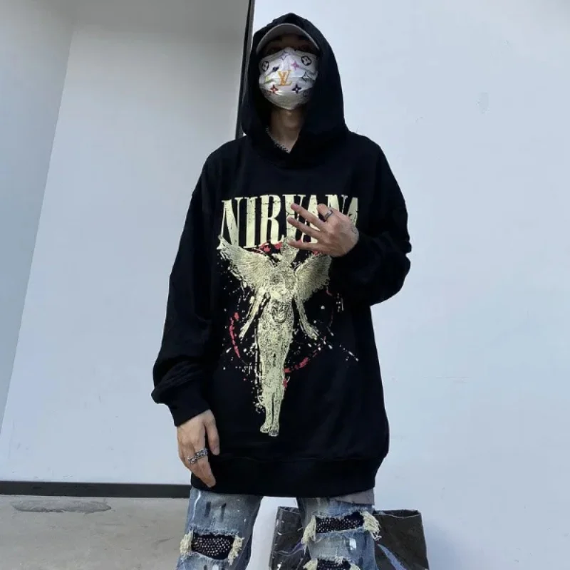 American retro hooded sweatshirt y2k personalized angel print loose hoodie trendy clothing hip-hop couple long-sleeved jacket