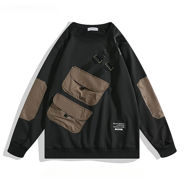 Enanhua American Style Patchwork Pocket Sweatshirts for Men/Women Personality Workwear Functional Long-sleeved Couple Bottoming Pullover