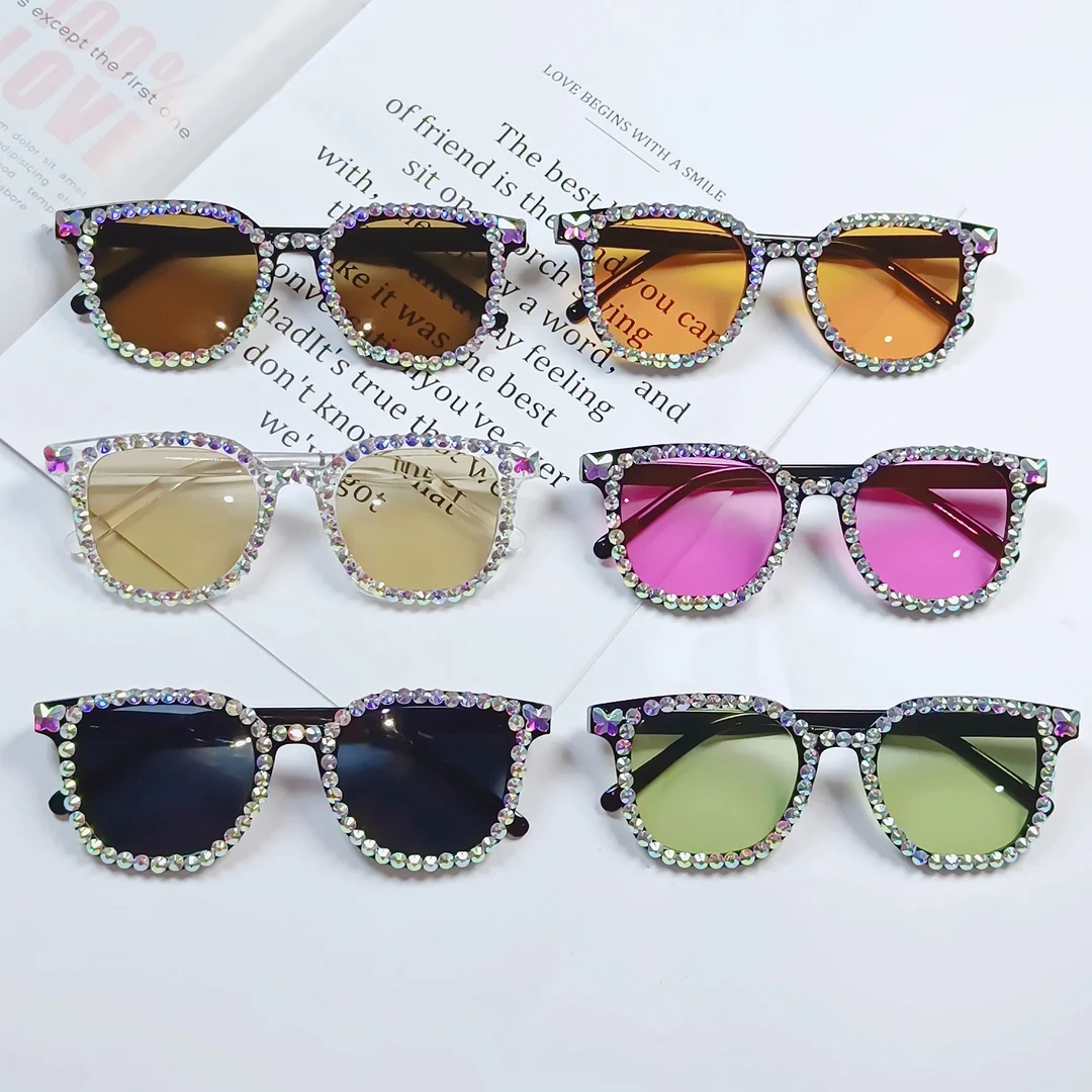 Name: sunglassesOptional colors: black frame black and gray pieces [set with diamonds], black frame tea pieces [set with diamonds], black frame yellow pieces [set with diamonds], black frame pink pieces [set with diamonds], black frame dark green pieces [set with diamonds], transparent Frame tea slices [diamond-encrusted]