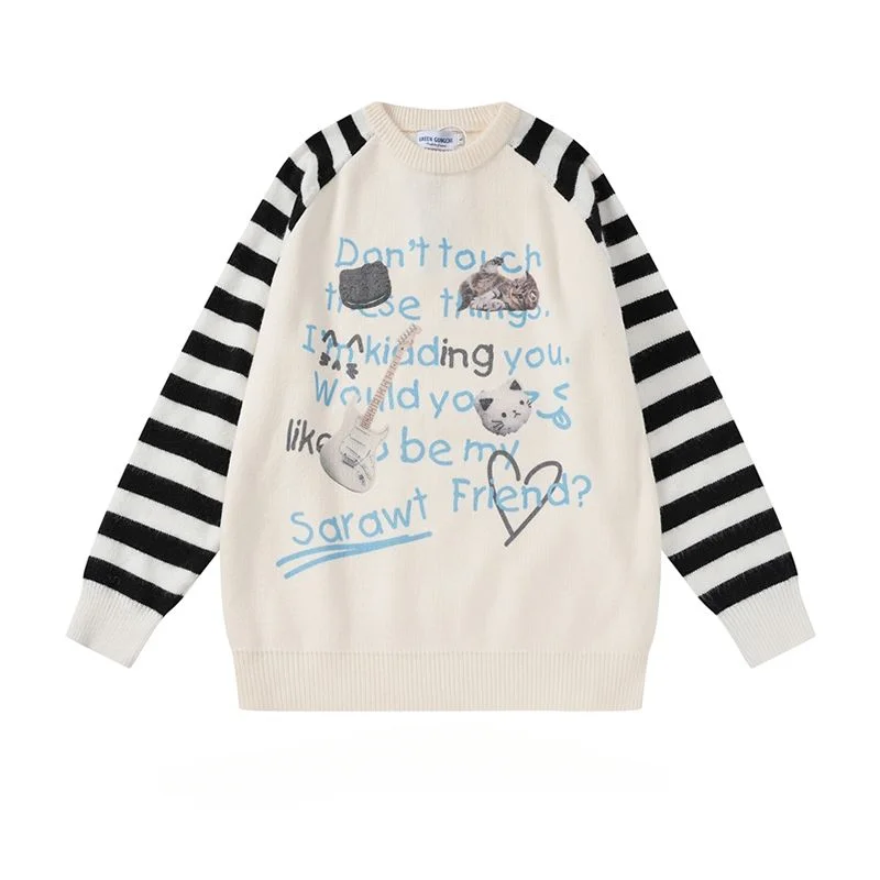 Demandernyc Men and Women American O-neck Striped Raglan Sleeve Print Pullovers Sweater Autumn Winter Casual Loose Versatile Couple Knitwear