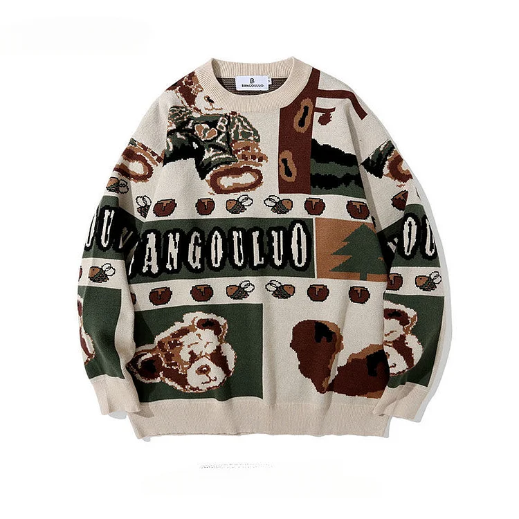 Demandernyc Men Women American O-neck Long-sleeved Jacquard Bear Sweaters Autumn Winter Lazy Style Outerwear Loose Casual Knitted Pullovers