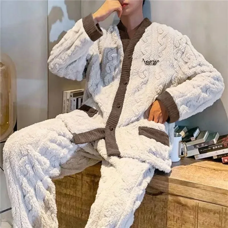 Winter Long Sleeve Thick Warm Flannel Pajama Sets For Men Coral Velvet Cute Cartoon Sleepwear Suit Pyjamas Homewear New.