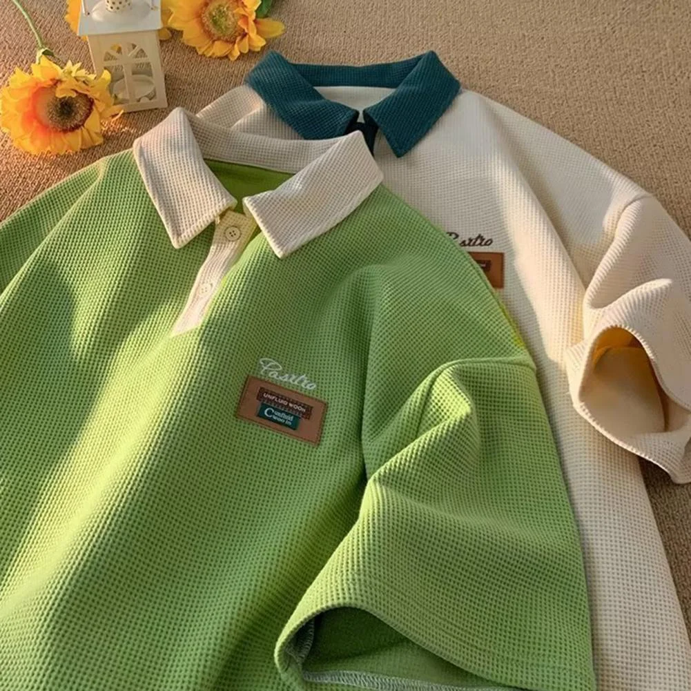 Summer Men T-shirt Turn-down Collar Vintage Loose Mid Length Waffle Texture Solid Color Half Sleeves American Style Streetwear Outdoor Top