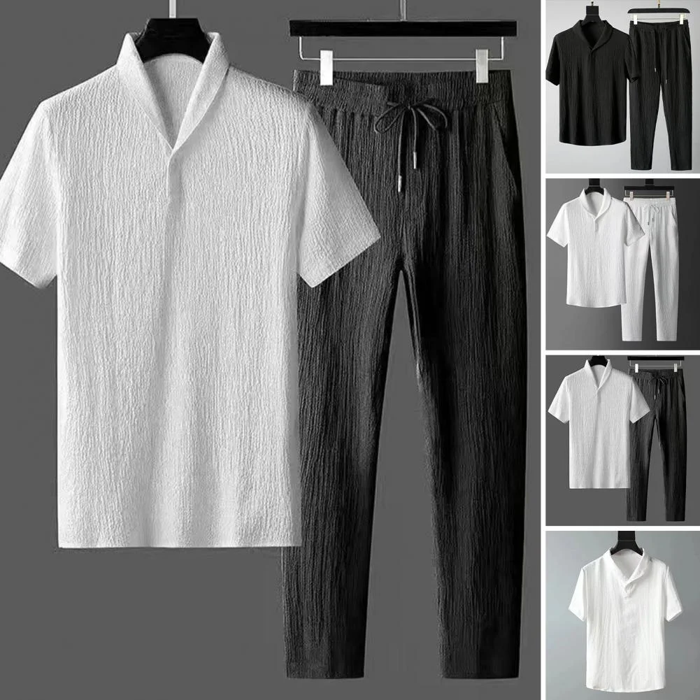 2Pcs/Set Men Summer Casual Outfit Lapel Short Sleeve T-shirt Elastic Drawstring Waist Long Pants Set Sportswear Set Jogger Tracksuit