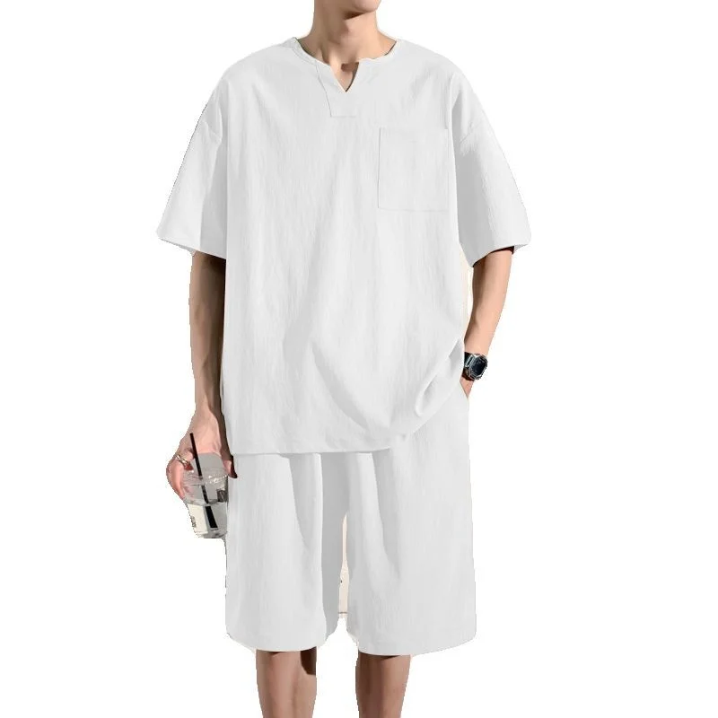 Summer Chinese Style Casual Suit Men's New Chinese V-neck Short-sleeved T-shirt Shorts Two-piece Suit